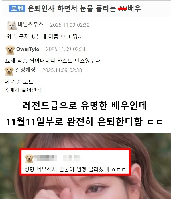 은퇴인사 하면서 눈물 흘리는 A..브이 배우 ㄷㄷㄷ November 12, 2025 pullman 인스타 사진 ㄷㄷㄷ 은퇴인사 하면서 눈물 흘리는 A..브이 배우 ㄷㄷㄷ 은퇴 영상보니까 성형 너무 많이 해서 얼굴이 완전 달라졌네 ㄷㄷㄷ Post Views: 323